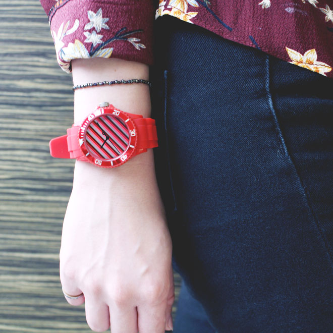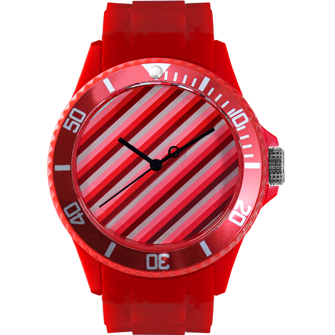 錶盤視覺以斜線為主,運用與錶殼相近色系帶出層次感,而錶針則是使用簡單的藍白色,讓錶針在繽紛的錶盤旋轉時,看起來像是拿著魔法筆的色彩家,不停地創造出令人驚喜的彩色世界。
