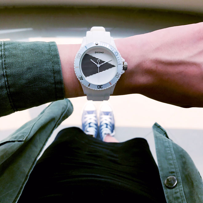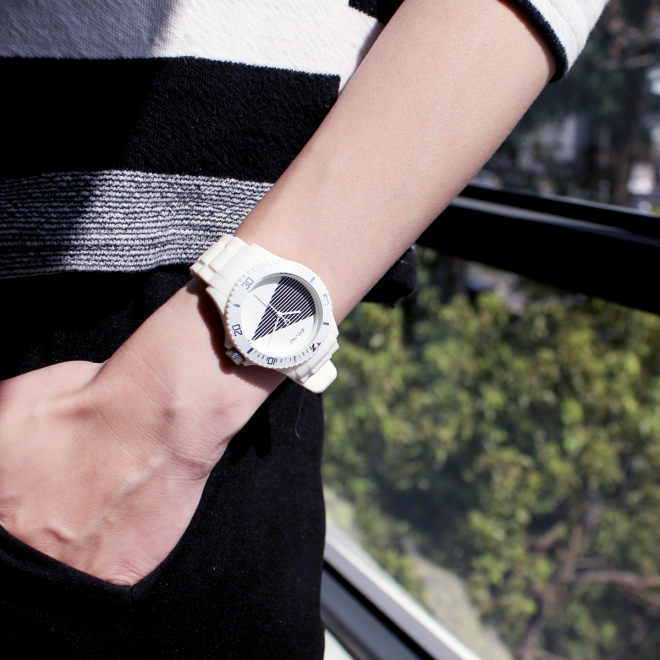 拿掉過多的色彩、裝飾與字釘,只有簡單的黑與白透過線條及幾何圖的交錯在對話,看似樸素卻傳達出錶面與錶針間不簡單的縱錯關係,讓我們一同掉入時間的派對裡吧!